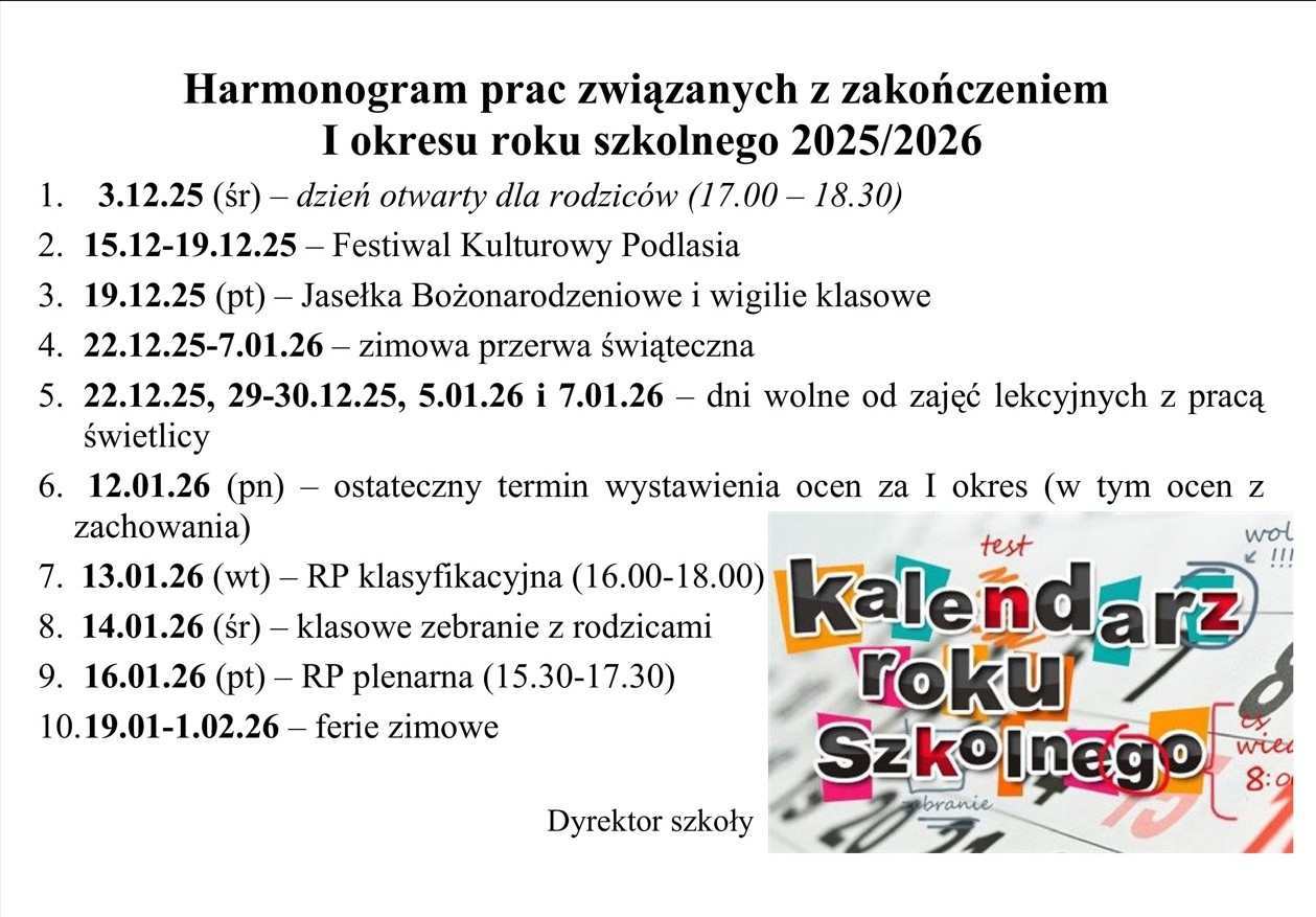 - 22.12.25, 29-30.12.25, 5.01.26 i 7.01.26 – dni wolne od zajęć lekcyjnych z pracą świetlicy