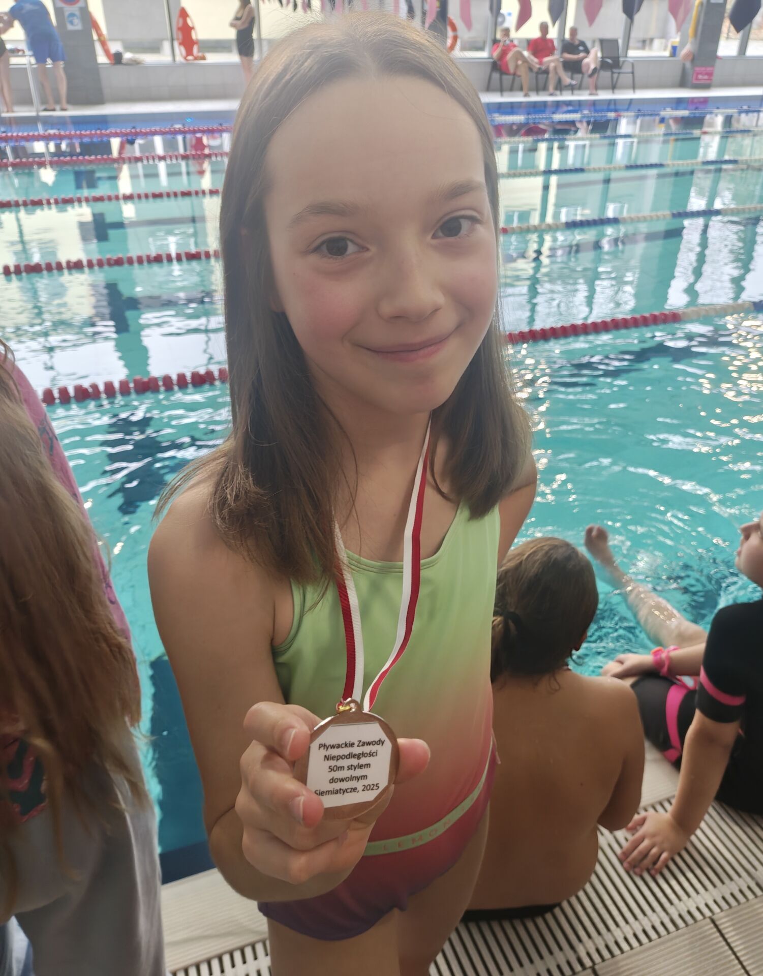 9 listopada nasza uczennica Apolonia Perkowska z kl. 4L brała udział w IV Pływackich Zawodach Niepodległości w Siemiatyczach. Startowała w dwóch konkurencjach. W swoim roczniku zdobyła złoty medal na 50m stylem klasycznym i srebrny medal na 50m stylem dowolnym.