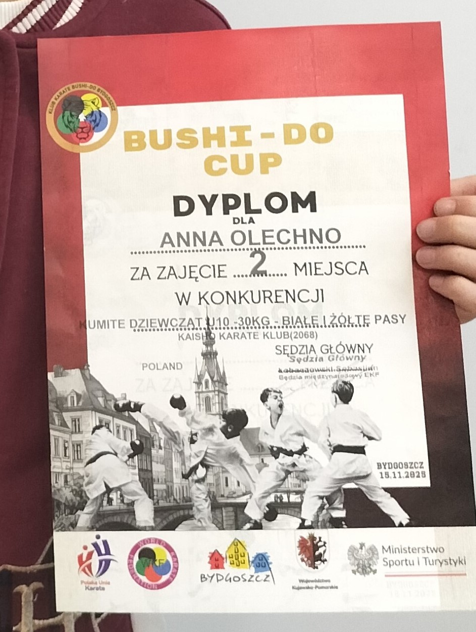 Turniej BUSHIDO -CUP 2025 w Bydgoszczy. Anna Olechno, uczennica klasy 3K zdobyła srebrny medal w kategorii kumite dziewcząt U10/30 kg. Jej drużyna zajęła 6 miejsce oraz brała udział w IV pocharze Polski dzieci i młodzików Karate. Gratulujemy.