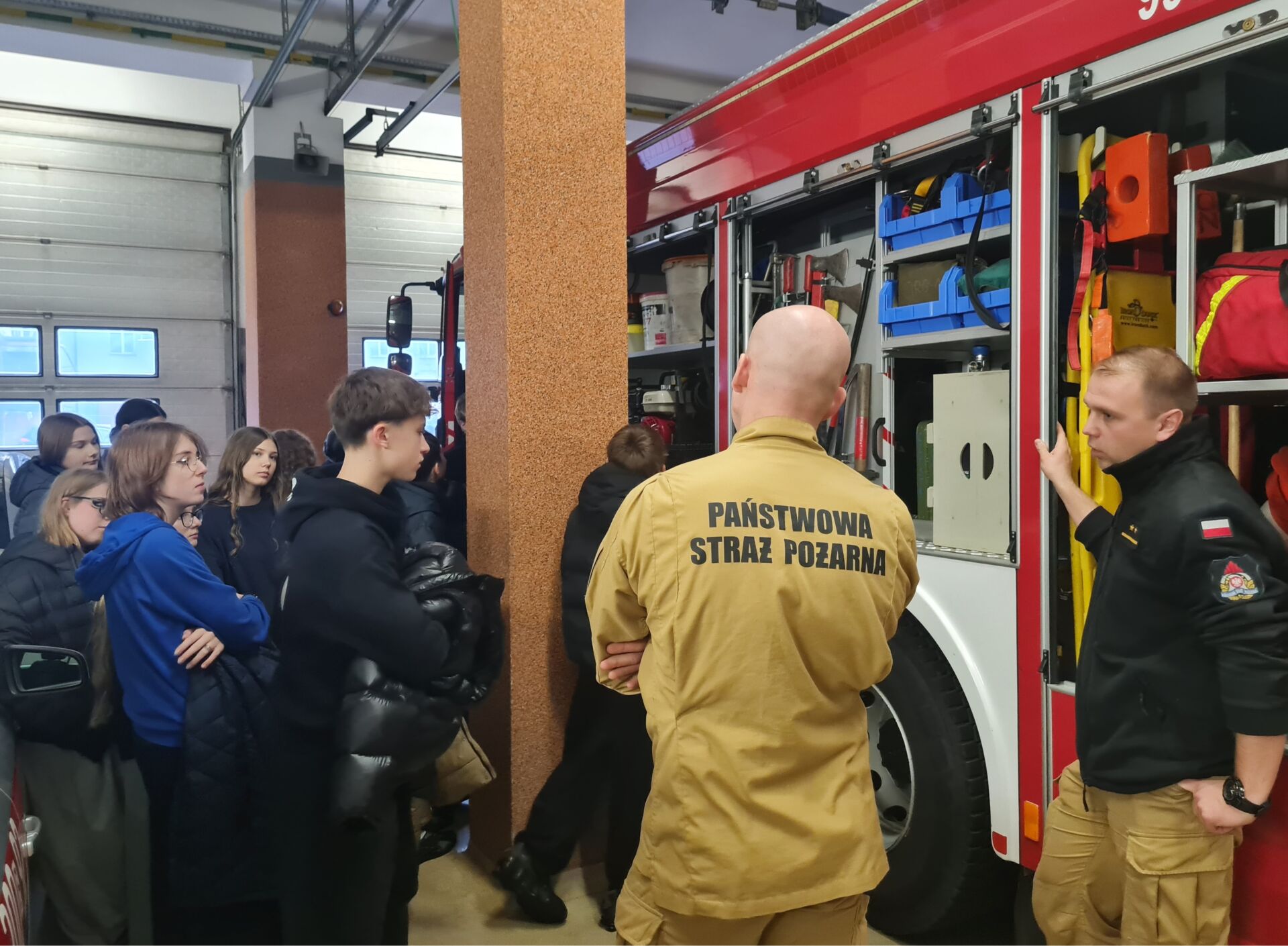 Podczas wizyty młodzież miała okazję poznać specyfikę zawodu strażaka oraz dowiedzieć się, na czym polega codzienna służba w jednostce ratowniczo-gaśniczej. Uczniowie obejrzeli wyposażenie wozów strażackich oraz poznali różnorodny sprzęt wykorzystywany podczas akcji ratunkowych. Wycieczka była nie tylko ciekawą lekcją praktyczną, lecz także doskonałą okazją do uświadomienia sobie, jak odpowiedzialna i wymagająca jest praca strażaka.