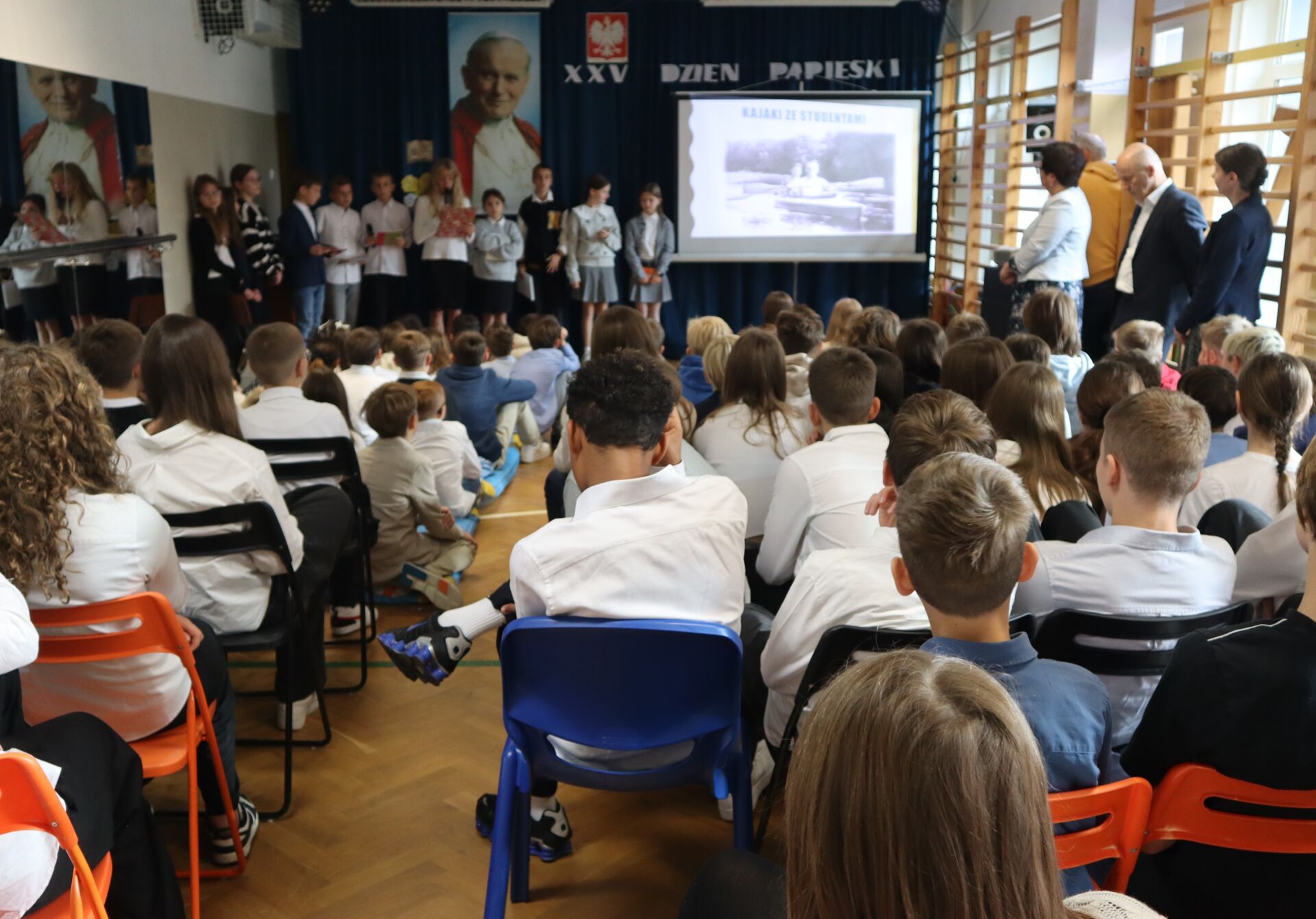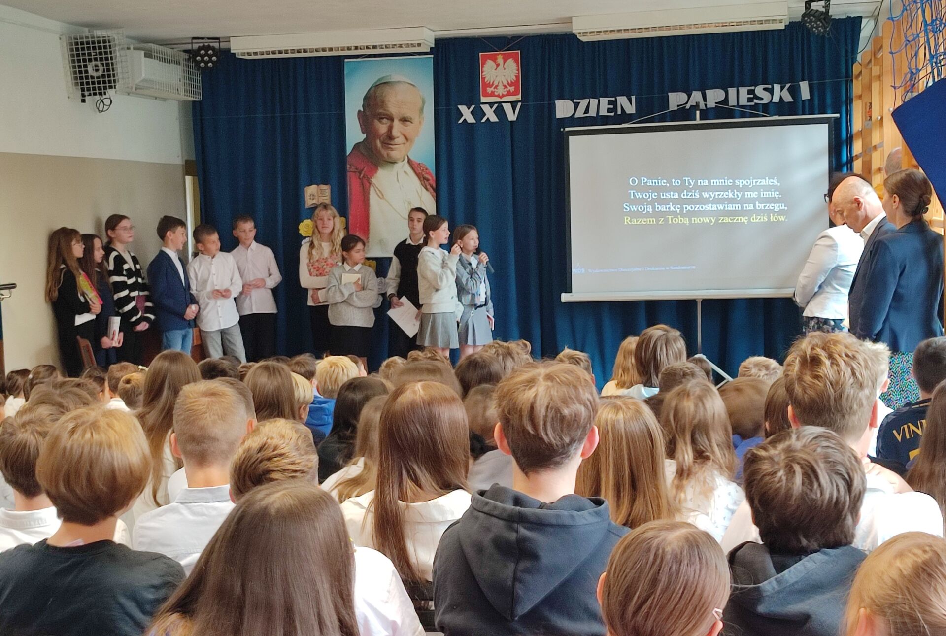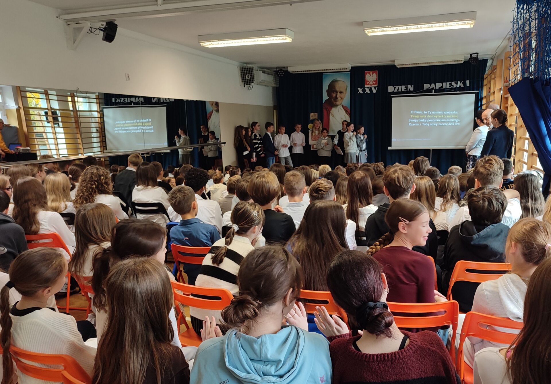 Dzień Papieski jak co roku w naszej szkole był okazją do przypomnienia i utrwalenia postaci Świętego Jana Pawła II. To wyjątkowy Polak, który swoim życiem i nauczaniem niósł ludziom wiarę, miłość i nadzieję. Na tegorocznym Dniu Papieskim uczniowie kl. 5L zaprezentowali wspomnienie o Janie Pawle II. Na zakończenie wszyscy uczniowie odśpiewali „Barkę” – ulubioną pieśń oazową Ojca Świętego.