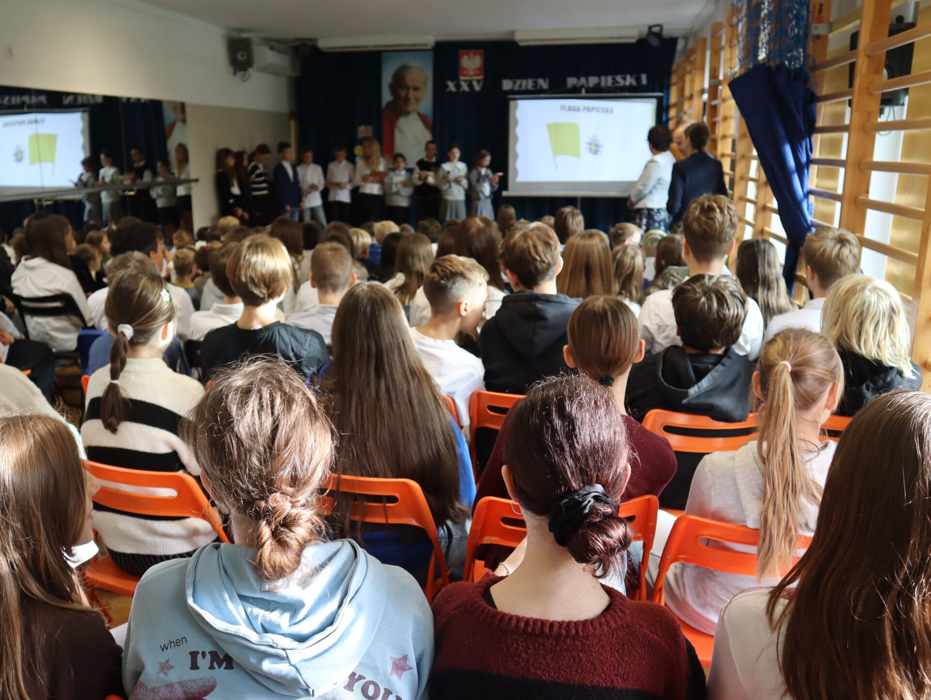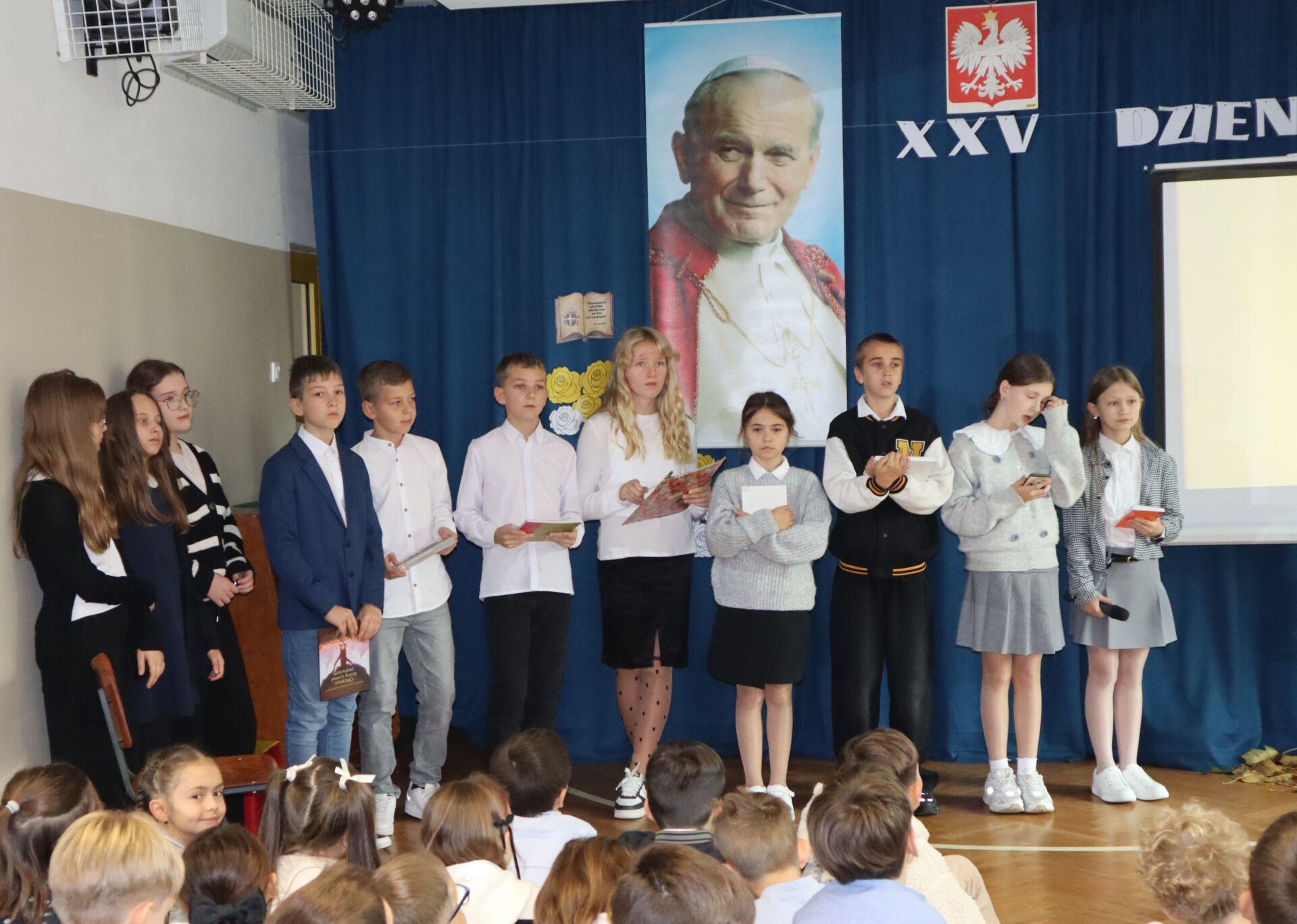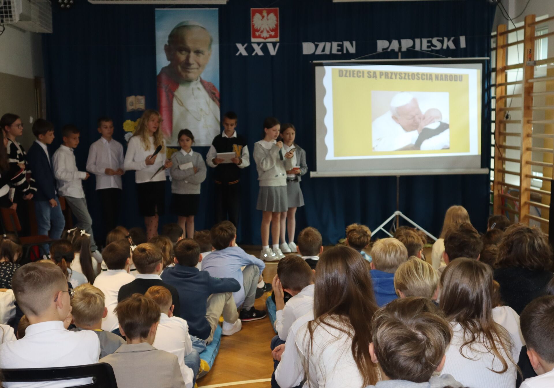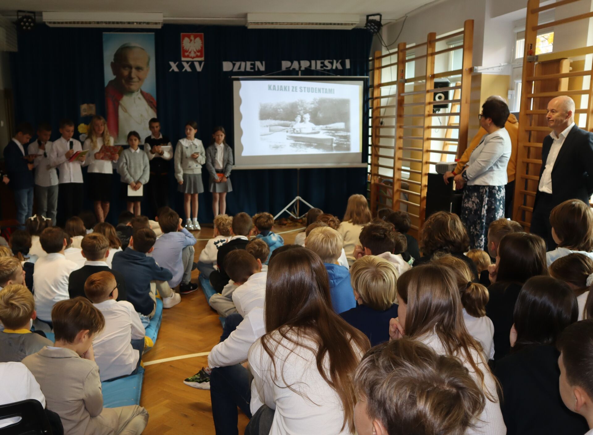 Dzień Papieski jak co roku w naszej szkole był okazją do przypomnienia i utrwalenia postaci Świętego Jana Pawła II. To wyjątkowy Polak, który swoim życiem i nauczaniem niósł ludziom wiarę, miłość i nadzieję. Na tegorocznym Dniu Papieskim uczniowie kl. 5L zaprezentowali wspomnienie o Janie Pawle II. Na zakończenie wszyscy uczniowie odśpiewali „Barkę” – ulubioną pieśń oazową Ojca Świętego.