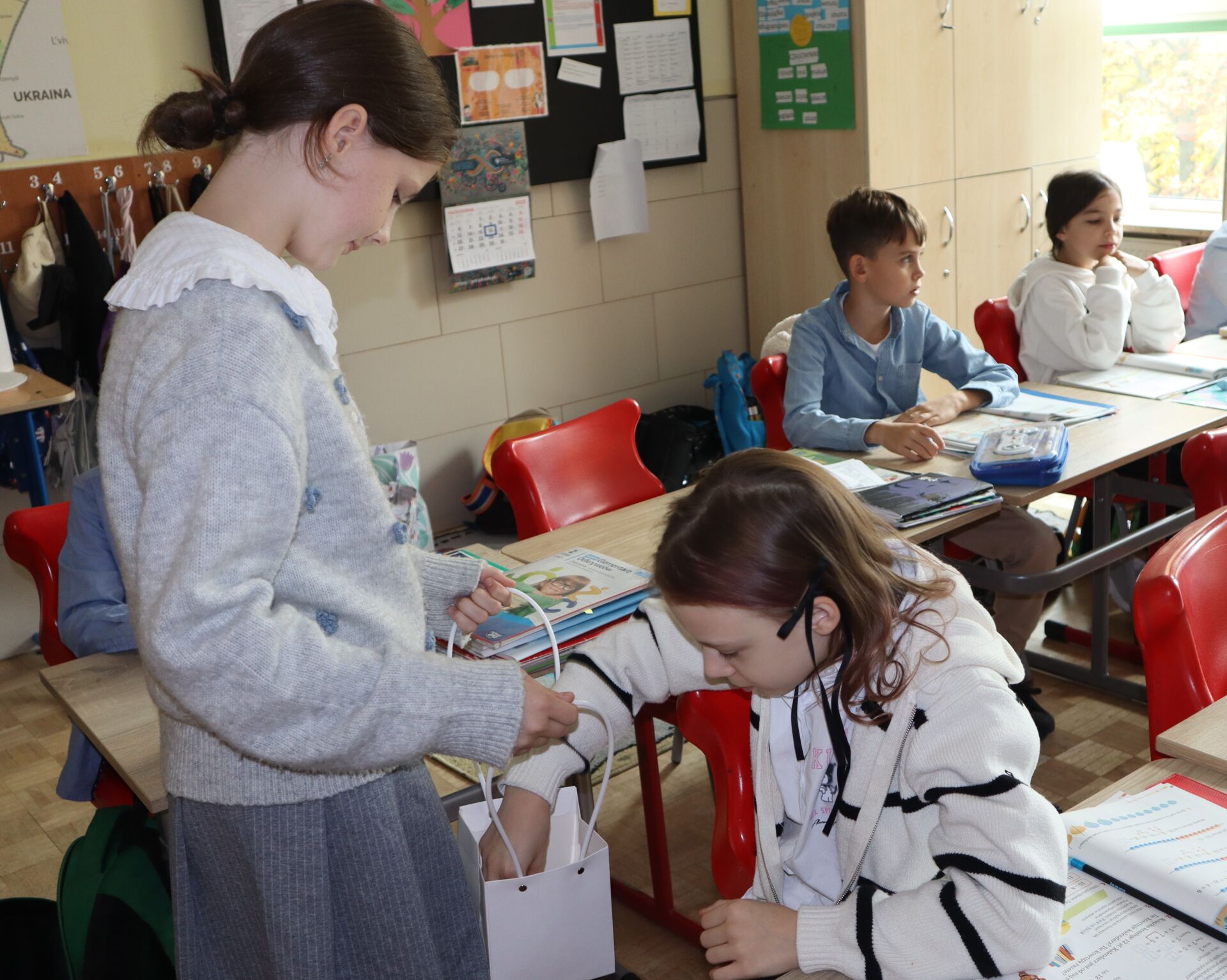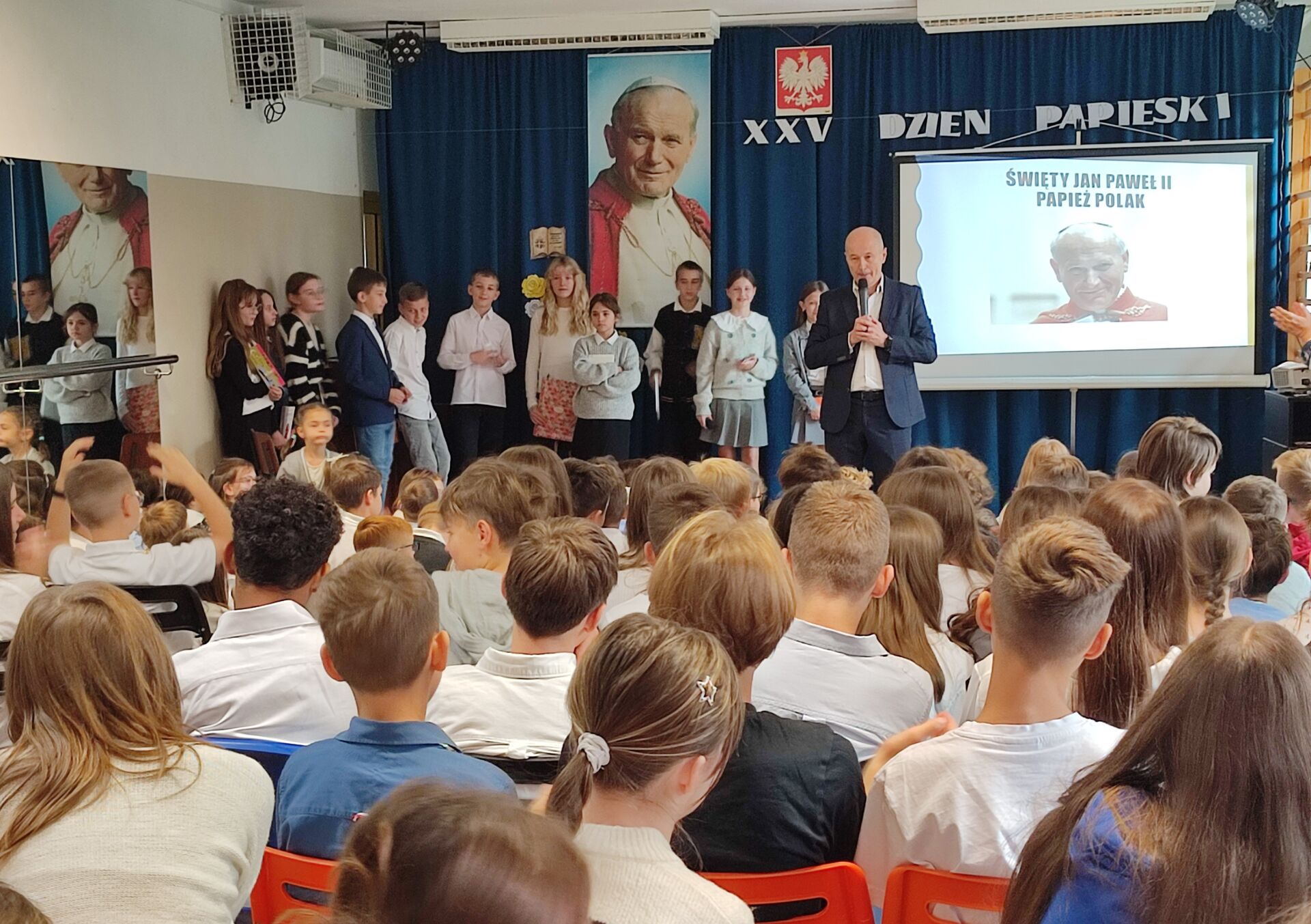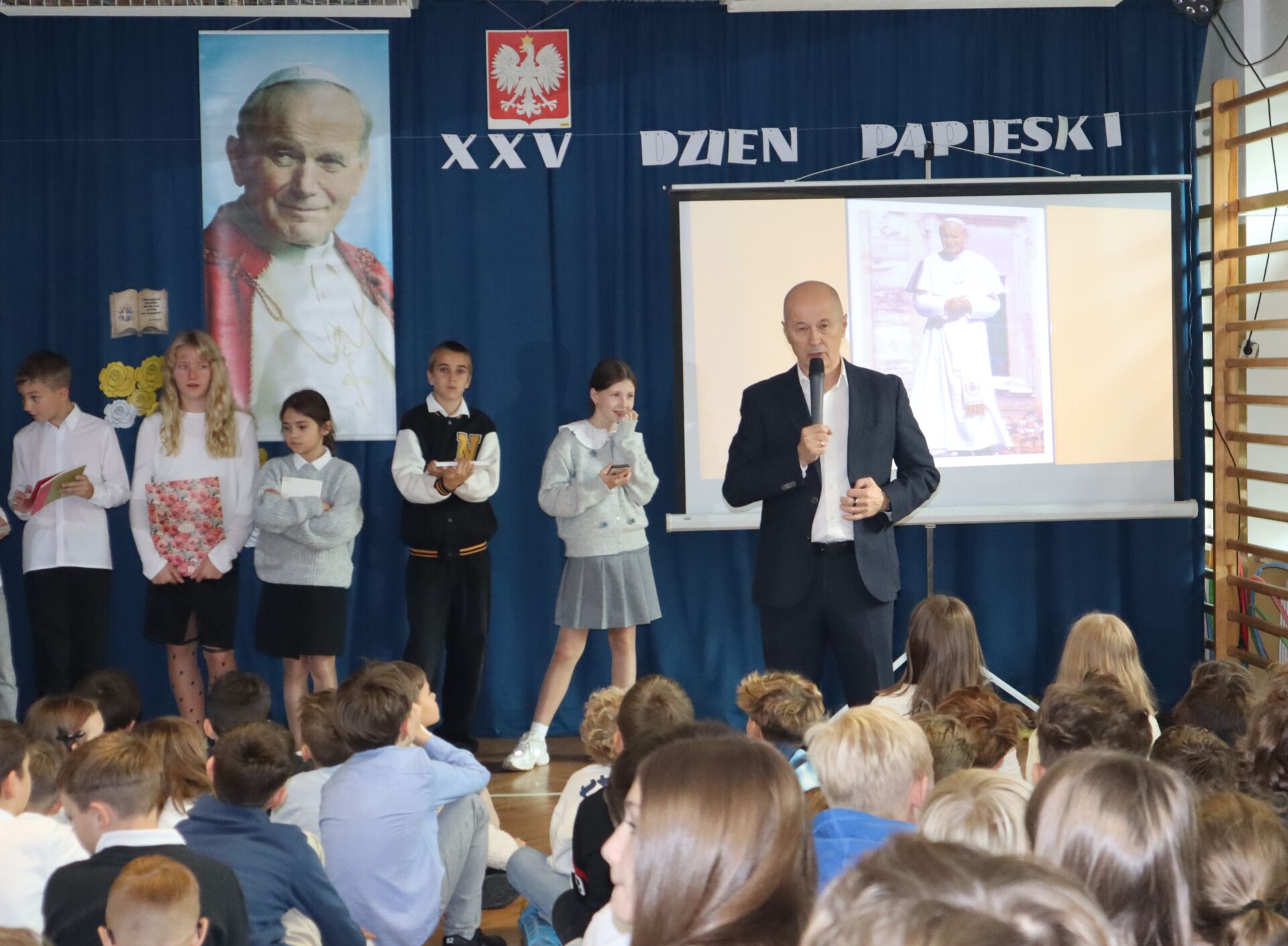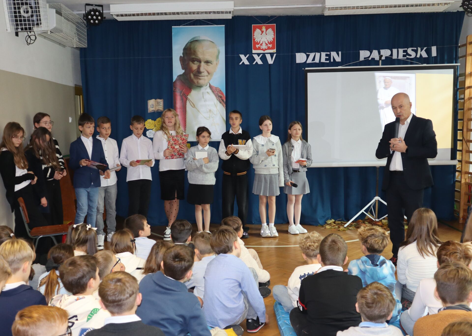 Pan Dyrektor podziękował uczniom i katechetkom za przygotowanie uroczystości i przedstawił wszystkim jak wielkim człowiekiem był Święty Jan Paweł II. Z tej okazji wszyscy uczniowie naszej szkoły otrzymali „Boże Krówki”.