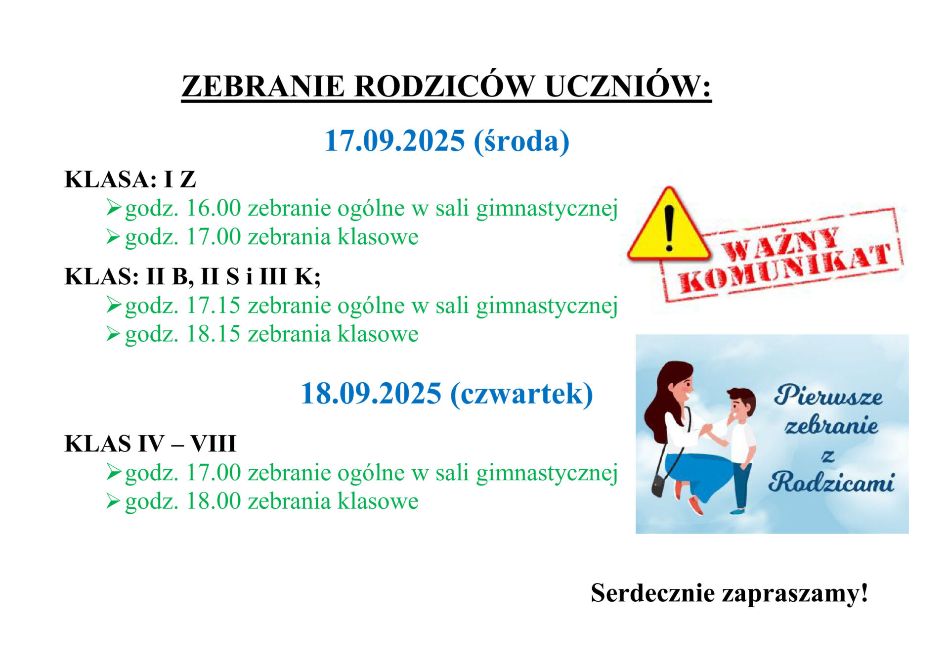 zebranie ZEBRANIE RODZICÓW UCZNIÓW: 17.09.2025 (środa) i 18.09.2025 (czwartek)