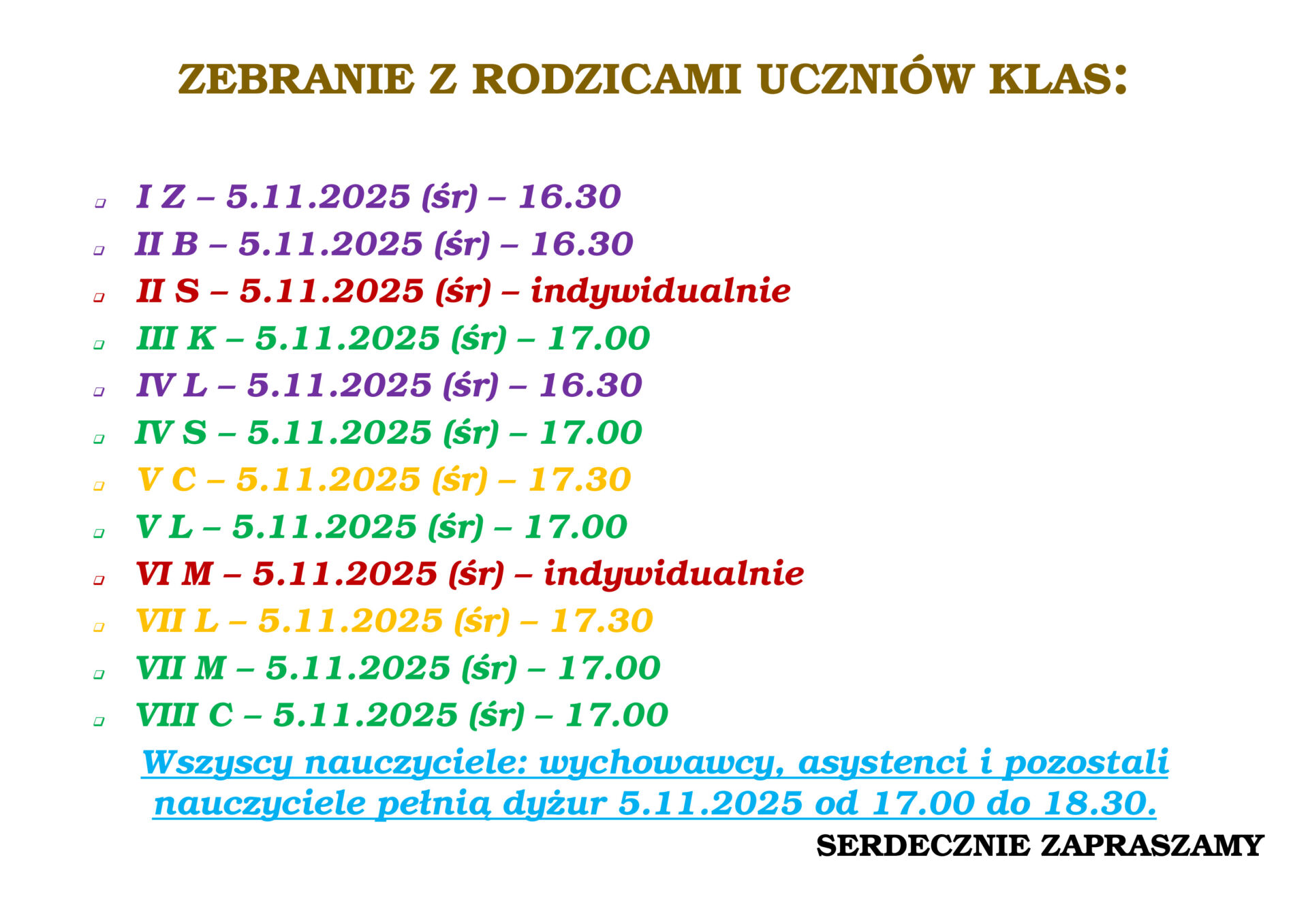 Wszyscy nauczyciele: wychowawcy, asystenci i pozostali nauczyciele pełnią dyżur 5.11.2025 od 17.00 do 18.30.